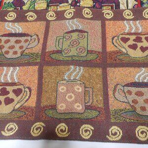 This product is a set of 2 decorative tapestry placemats featuring decorative hot cups of tea or coffee designs and bottles of wine with wine glasses and grapes designs, perfect for adding a touch of fall decor to your dining table. The rectangular placemats are machine washable and made of tapestry material, making them durable and easy to care for. The multicolor designs are versatile for various occasions, making them a stylish and practical addition to your home dining or kitchen linens. These both measure 12 by 18 inches and come to you in good, clean, condition as shown here. The coffee placemat is also lined with a washable brown material. All my items are shipped the same day that payment is received from a clean, smoke free, home!