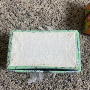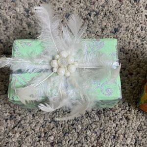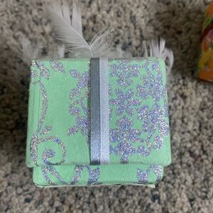 2 Decorated Small Gift Boxes. Mint green with iridescent glitter pattern, light & dark silver ribbon, white feathers & faux pearls. Orange floral sparkle with bright pink & green ribbon & pink ribbon flower with faux pink pearl center. Closed measure approx 4”x2.25”2”. Sturdy Good condition.