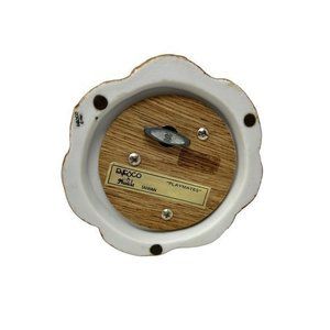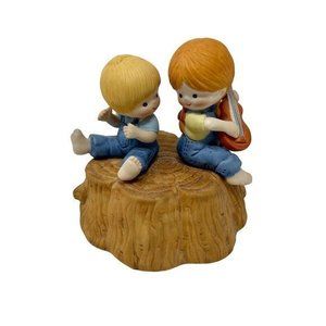 An Ensco Ceramic Music Box with 2 children on a tree stump. The song it plays is "Playmates" and has a sliding lever to turn it off and on. It is 4 1/2" wide and 4 1/2 " high.