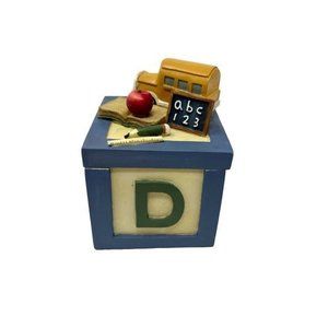 A hand painted Resin School themed box from the School Days Collection by Artisan Flair, Inc. The box has a removeable lid and could hold paper clips or other small items. It is 4" high and 2 1/2" wide
