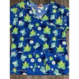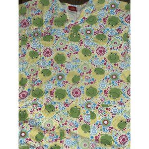 2 Dickies Womens Scrub V-Neck Top Frog Print Size XS "Toad ally Cool" Green Blue