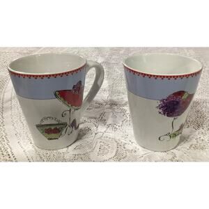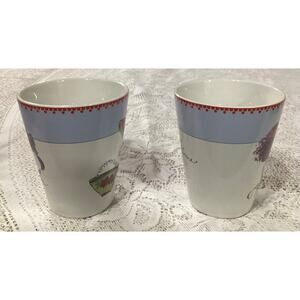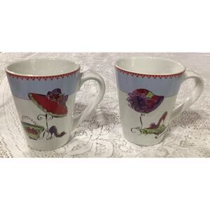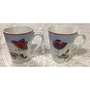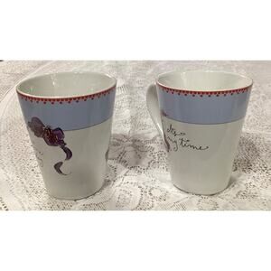 The product is a set of two Rosanna mugs, one with the phrase "It's My Time" and the other with "Time to Play." These round, medium-sized coffee mugs are made of ceramic and porcelain materials, featuring a French-inspired design with a fashion-themed pattern and colorful multicolor accents. Perfect for hot or cold beverages, these mugs are an original Rosanna franchise product manufactured in China during the 2000-2009 time period. Ideal for all occasions and suitable for both hot and cold drinks, this two-piece set is a charming addition to any kitchen or home collection.