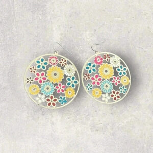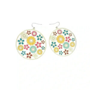 2” EARRINGS ROUND GOLD TIN W/ Multicolored FLORAL PRINT DROP