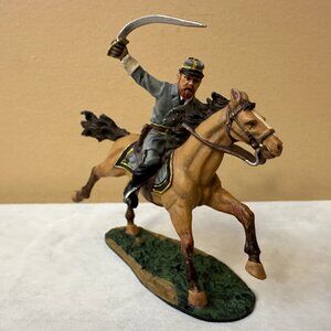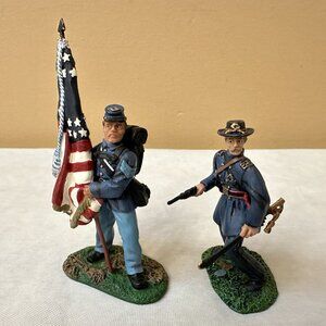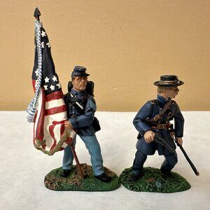 These are 2 ERTLE Britain American Civil War figure sets. They are the 17110 Union Command Set - 69th Pennsylvania and the 17287 Leaders In Blue And Gray - George E. Pickett on Horseback sets. Both sets are in fantastic condition with no chips, breaks, cracks or any real flaws to the figures. The box of The Pennsylvania 69th has wrinkles on the front in 2 spots on the top and bottom left corners. Both of these are shown in the photos. Other than that they are in great shape. These come from a smoke free and pet free home and will be packaged and shipped with great care.