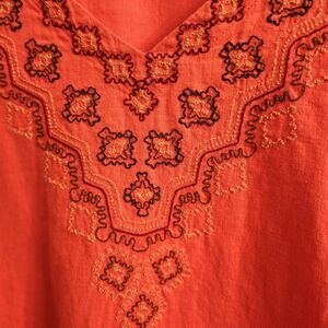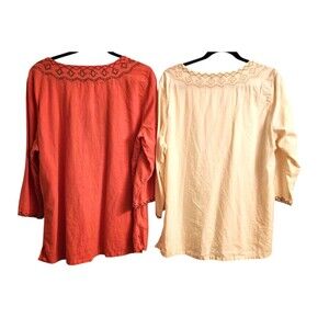 This product is a pair of Eddie Bauer Vista Point Tunics in a linen blend in coral and ivory with embroidered accents. The tunics have a V-neckline, pullover closure, and a relaxed fit, making them ideal for casual occasions in the summer, fall, or spring. Made from a comfortable blend of rayon and linen, these tunics are machine washable for easy care. The size XL ensures a comfortable and stylish fit for women looking for a versatile and trendy top.