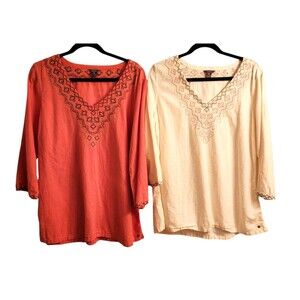2 Eddie Bauer Vista Point Tunics Linen Blend Coral/Ivory Embroidered Size XL