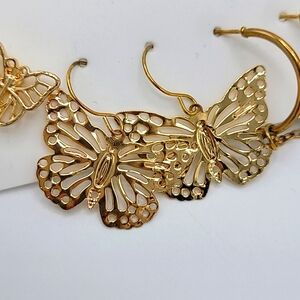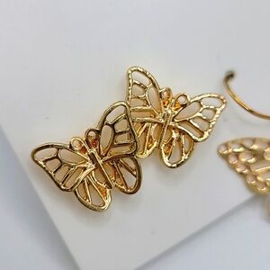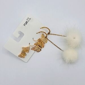 Super cute and fun earring set in gold tone, featuring stud butterflies, dangle butterflies, and whaite fuax fur drops.