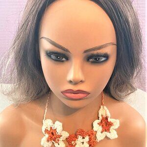 Crocheted with Lace this head band has flowers that are a brownish bronze and white color.