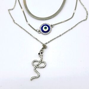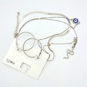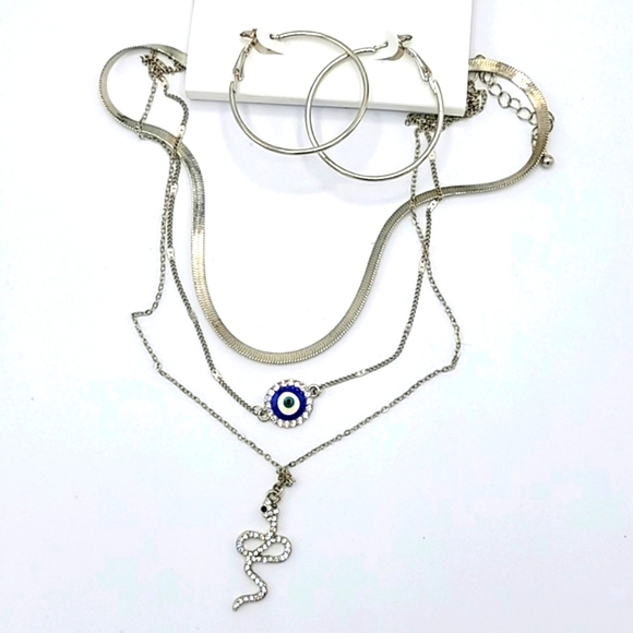 Layered necklace and earring set in silver tone featuring the serpent and all seeing eye. Shine from every angle! Can be worn as a layered look or separate pieces!