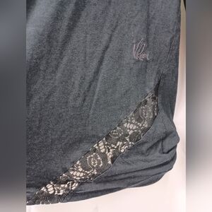 This top is dark in color, and features lace detailing on the shoulders and along the hemline. The neckline is wide and rounded, and the fabric appears to be soft and slightly stretchy. The lace detailing adds a touch of elegance and femininity to the otherwise simple design.