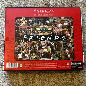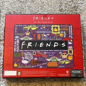 Two FRIENDS themed jigsaw puzzle boxes shown. Colorful collage and illustrated box art are visible. Puzzle branding and graphics are clear. Great for fans and collectors. One never opened. One completed one time. No pieces missing