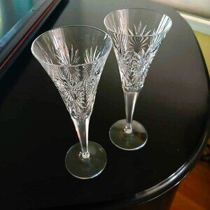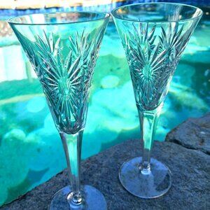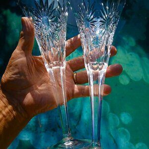 This is a lovely pair of Fabulous Waterford deep Cut Crystal MILLENNIUM Health Series Champagne Flutes. The flutes are part of a limited series called "Millennium Health" produced in the late 1900's early 2000's. There are 5 deep cut starbursts equally dispersed around the circumference of the flare up flute with a thick 6 sided facet stem set upon a round foot.