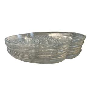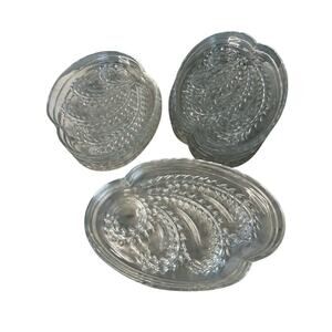 This is a set of 2 vintage Federal Glass snack trays with a wheat sheaf design, made of clear glass in a Mid-Century Modern style. Each tray is 1/2 inch in height and 10 inches in width, with a total weight of 2 pounds and 3 ounces for both trays. The trays are from the 1950s and are an original design by Federal Glass.