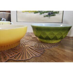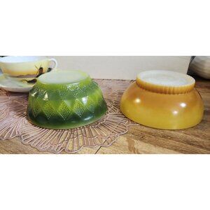 Set of two vintage 1970's Fire King 5" ombre bowls. One avocado green Kimberly with raised diamond design, one orange to yellow ribbed foot. Some small flea bites to the glaze on the raised dots. No chips, minimal signs of use. 5" wide, 2" high.