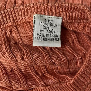 This Liz Claiborne cardigan sweater is a must-have for any fashion-conscious woman. The burnt orange silk material is perfect for the upcoming fall and winter seasons, while the long sleeves and button-up design provide a comfortable and stylish fit. The sweater is labeled as a size L and is suitable for regular size types. Its Y2K style and fisherman character make it a unique addition to any wardrobe.