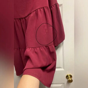 This has been worn and washed some and in mostly god condition other than the stain shown in the pictures. I do not recall what this stain is, but it looks like it’s probably from bleach. I am also unsure as to the brand. This dress runs large as I was a size medium when I wore it.