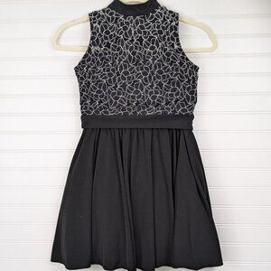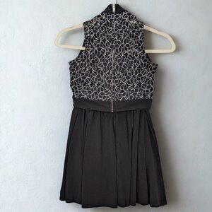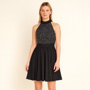 mini dress, cocktail dress, sleeveless dress, black, ebony, jet black, silver, metallic, floral embroidery, lace overlay, textured bodice, smooth skirt, fit and flare, A-line silhouette, high neckline,