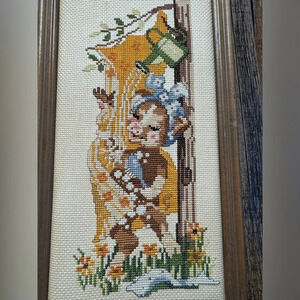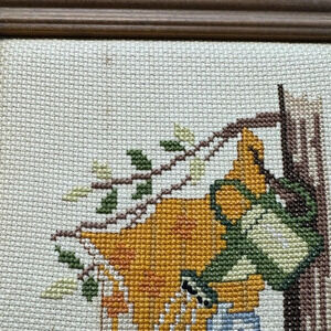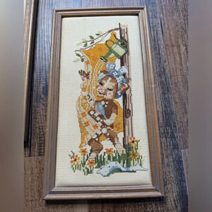 (2) Framed Pig Needlepoint Embroidery Anthropomorphic Animal Novelty Boho 70s