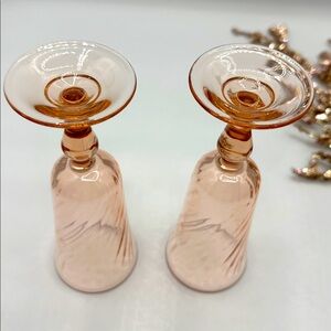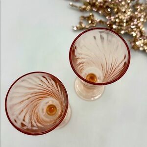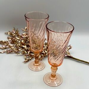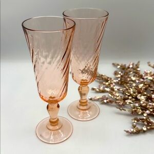 Two beautiful romantic peach colored champagne flutes. Made in France br Arcoroc. No chips or cracks. It is a gorgeous pattern called Rosaline optic swirl.