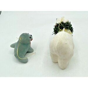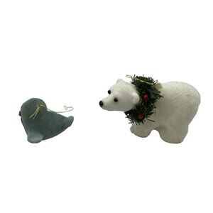 2 Fuzzy Christmas Ornaments Seal & Polar Bear Flocked Holiday Decor Kitsch Retro in very good pre-owned condition. Some of the fuzzy flocking is missing on the seal's left arm. There is a small area of discoloration on the polar bear's left rear leg. Please see the pictures.