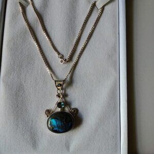 2" GREEN RAINBOW MOONSTONE CABOCHON W/BLUE TOPAZ W/.5" BALE AND 16" STERLING CHAIN