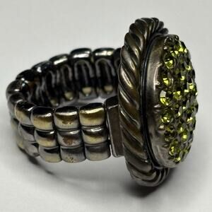 The product is a set of two adjustable rings with five snap charms by the brand Gingersnaps. The rings are silver plated and feature simulated rhinestone stones that have been heated and pressure-treated. The charm style is a snap charm, and the rings are adjustable to fit different sizes. The design is a silver color with a round main stone shape, perfect for adding a touch of glamour to any outfit.