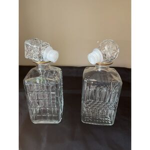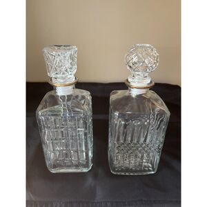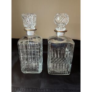 One of these decanters is from Target Bullseye Playground, possibly both since they have same style stopper and gold rim. Last photo are the tops put on correctly after research. They are in good pre-owned condition no cracks or chips.