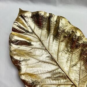 Enhance your dining table with this exquisite gold serveware tray, designed to mimic the natural elegance of a leaf. Its detailed vein patterns and shiny, reflective surface make it a perfect choice for serving appetizers or as a decorative centerpiece.