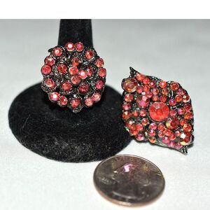 2 Gothic Victorian Red Rhinestone Black Metal Size 8-10 Adj. Glam Party Rings