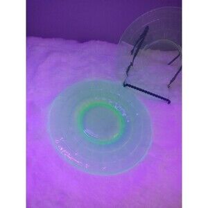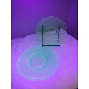 This set of two green Uranuim vaseline block optic dessert plates is a fantastic addition to any vintage glassware collection. The plates measure 6" in diameter and feature a beautiful art deco style with a block pattern design. They are made of high-quality depression glass and were produced by Anchor Hocking in the United States between 1930-1939.