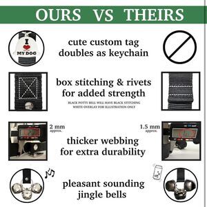 POTTY BELLS are made with a rugged nylon adjustable length strap. With the carefully placed snaps, you can adjust the strap length from 30”- 32” to fit your needs.