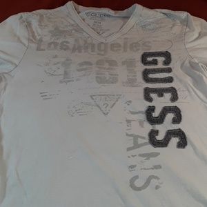 This is for 2 Guess Tshirts that are size Medium. 1st, is A white Guess shirt that says Los Angeles 1981 and 2nd, is A blueGuess Jeans Lis Angeles 1981. The white shirt has A few tiny holes kike seen in the picture. These shirts are in good condition. Both shirts are 25" inches from shoulder to bottom if shirt a d 20" inches from pit to pit.