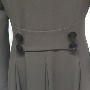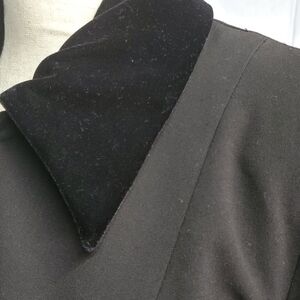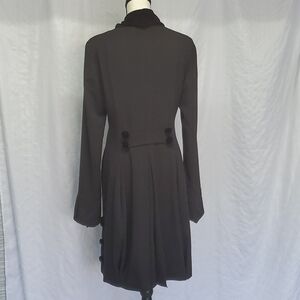 Black vintage style fully lined long jacket, this jacket is stunning. Polyester, spandex and rayon, fully lined with 100% polyester. Velvet buttons adorn the front, cuffs, and side splits along with a velvet collar just beautiful. The length from shoulder to hem is 38" and pit to pit 19.5". This jacket can be worn to a formal affair or can be dressed down with a pair of jeans and black boots or shoes. very versatile. size medium.