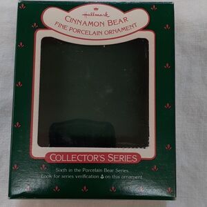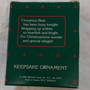 2 Hallmark Keepsake Cinnamon Bear ornaments. First one is Cinnamon Bear has been busy tonight Wrapping up wishes so heartfelt and bright, For Christmastime wonder and special delight! Second ornament is Cinnamon Bear picked this holiday gift and wrapped it up brightly with care, Because it's a heart full of memories and dreams and wonderful feelings to share.