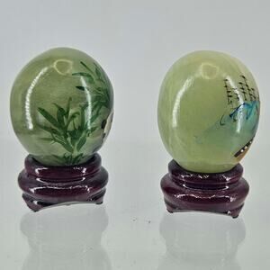 2 HAND PAINTED MINIATURE GREEN JADE EGGS WOODEN STANDS PANDA GREAT WALL OF CHINA. MEASURES ABOUT 1.75" T. IN GREAT CONDITION, NO FLAWS.