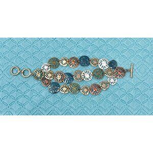 These beautifully crafted bracelets offer a combination of artistry and elegance. The first is a striking piece with mixed metal coins, showcasing intricate designs that capture the light with every movement. The second bracelet features a vibrant array of blue beads interwoven with silver accents, creating a dynamic and eye-catching piece that adds a pop of color to any ensemble. Together, they offer versatility, allowing for both individual wear and stylish pairing.