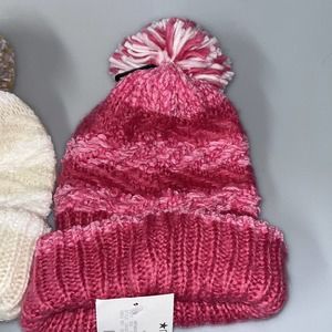 2 INC International Concepts Ivory Chenille Striped Medium Pink Pom Beanies NWT