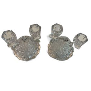 These vintage Imperial Glass Ohio double candle holders are a beautiful addition to any room with their laced edge design and retro style. Made of clear glass and suitable for taper/dinner candles, these medium-sized holders are perfect for entryways, foyers, living rooms, and dining rooms. With easy-care instructions and decorative features, these candle holders are a charming and elegant choice for adding ambiance to your space. Made in the United States, these holders are a classic and timeless piece for any home decor.