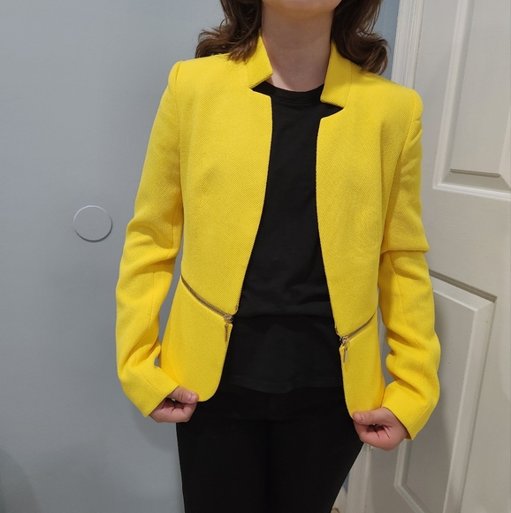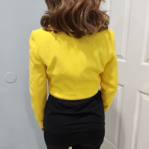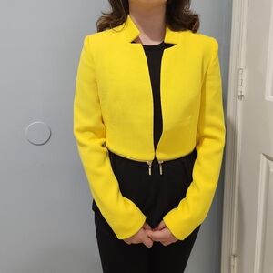 Almost New. This unique jacket that makes a statement with its vibrant yellow color you can use two ways. First as a smart option and second just unzip the bottom and wear it over dress or w skirt for elegant evening.