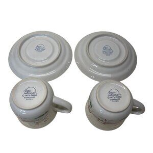 These vintage 1992 International China Country Christmas cup and saucer sets offer festive charm for holiday dining. Each cup and saucer is decorated with a delightful Christmas motif.
