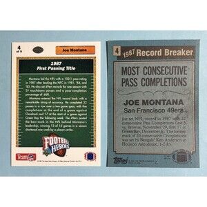 The product is a lot of two Football trading cards featuring Joe Montana, the legendary quarterback of the San Francisco 49ers. The cards showcase Montana as the passing leader in the NFL for the 1987 season and also highlight his achievements in the 1988 Topps and 1991 UD cards. Manufactured by Topps and Upper Deck these standard-sized sports trading cards are a valuable addition to any collection of NFL memorabilia, particularly for fans of Joe Montana and the 49ers.