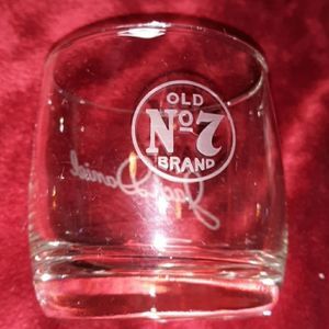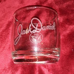 2 short cocktail glasses by Jack Daniel's. They're different but they're a matching pair. They measure 3½" tall and the opening is 3" across.