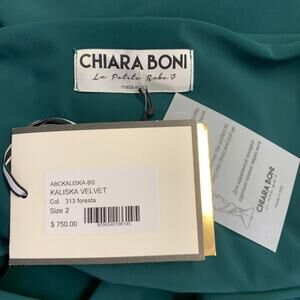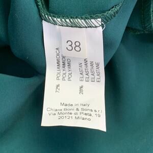 CHIARA BONI "Kaliska" midi dress in a green polyamide stretch blend fabric featuring velvet panels, off shoulder design, and 3/4 sleeves. Made in Italy.