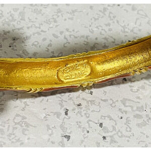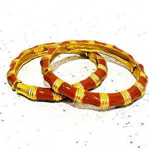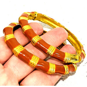 TWO Kenneth J Lane bangle bracelets - slim goldtone metal finished with a deep burnt orange color enamel in a ribbed hinged design. Both bracelets are hallmarked Kenneth Lane inside - both are similar but slightly different from each other - they make a nice set to wear together. One size will fit most. In excellent condition - minor surface wear but no significant damage or flaws - so cute!