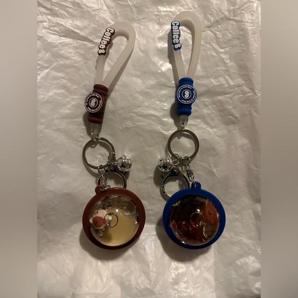 2 Keychains one with a cat and like milk floating and the other with a bear and like coffee floating in it both new never used (price firm)