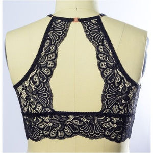 Black high neck lace racerback bralette. 88% nylon and 12% spandex. No padding.
