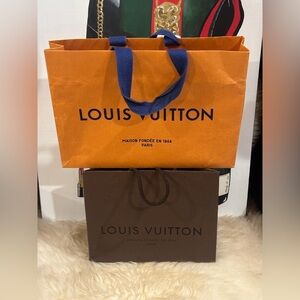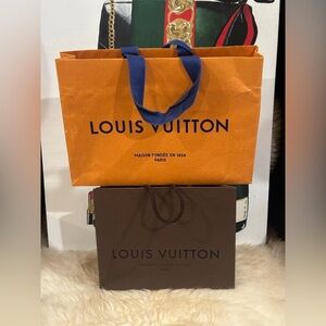 Elegant Louis Vuitton shopping bags. Features vibrant orange and classic brown. Ideal for luxury gifting.