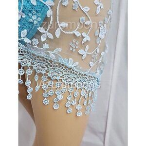 Set of 2 metallic lace skirt wraps in shimmering ice blue and pink. Each measures approx. 57" x 18"—perfect as hip scarves for belly dance, festival wear, beach cover-ups, or costume styling. Lightweight, sheer, with a soft metallic shimmer.