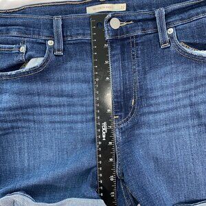 These Levi's Mid Length Shorts for women in size 32 feature a classic blue wash with a mid-rise fit and a 4-inch inseam, perfect for a casual or travel occasion. Made from a comfortable cotton blend denim fabric with stretch, these shorts have a 5-pocket design with button and zipper closure, along with the signature Levi's logo accents. The versatile design is suitable for summer and spring seasons, making them a stylish and practical addition to any wardrobe.