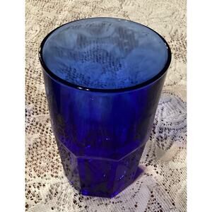 The product is a set of two Libbey Crisa Glass cobalt blue tumblers with an 8 panel design, measuring 5.5 inches in height and with a capacity of 16 ounces. These vintage glasses are styled in a mid-century modern aesthetic, perfect for all occasions and suitable for both teens and unisex adults. Crafted from glass, these original tumblers are a stylish addition to any drinkware collection, adding a pop of blue color and a touch of retro charm.
